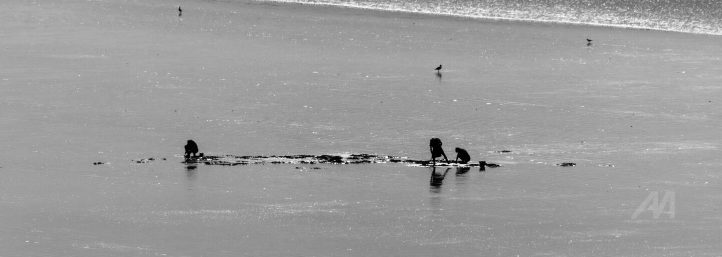 Scène captée sur la plage de Pentrez. Finistère. En contre-lumière. Développement monochrome, noir et blanc.