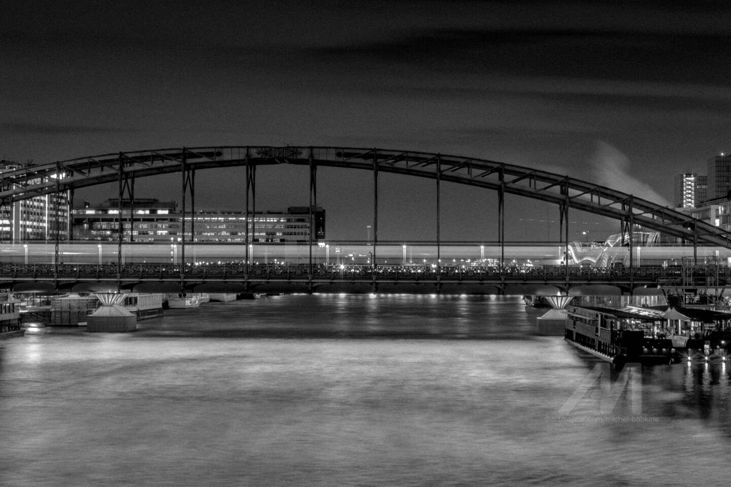 Scène de nuit, depuis le pont d'Austerlitz, vue sur la Seine, les péniches, le ministère des finances.