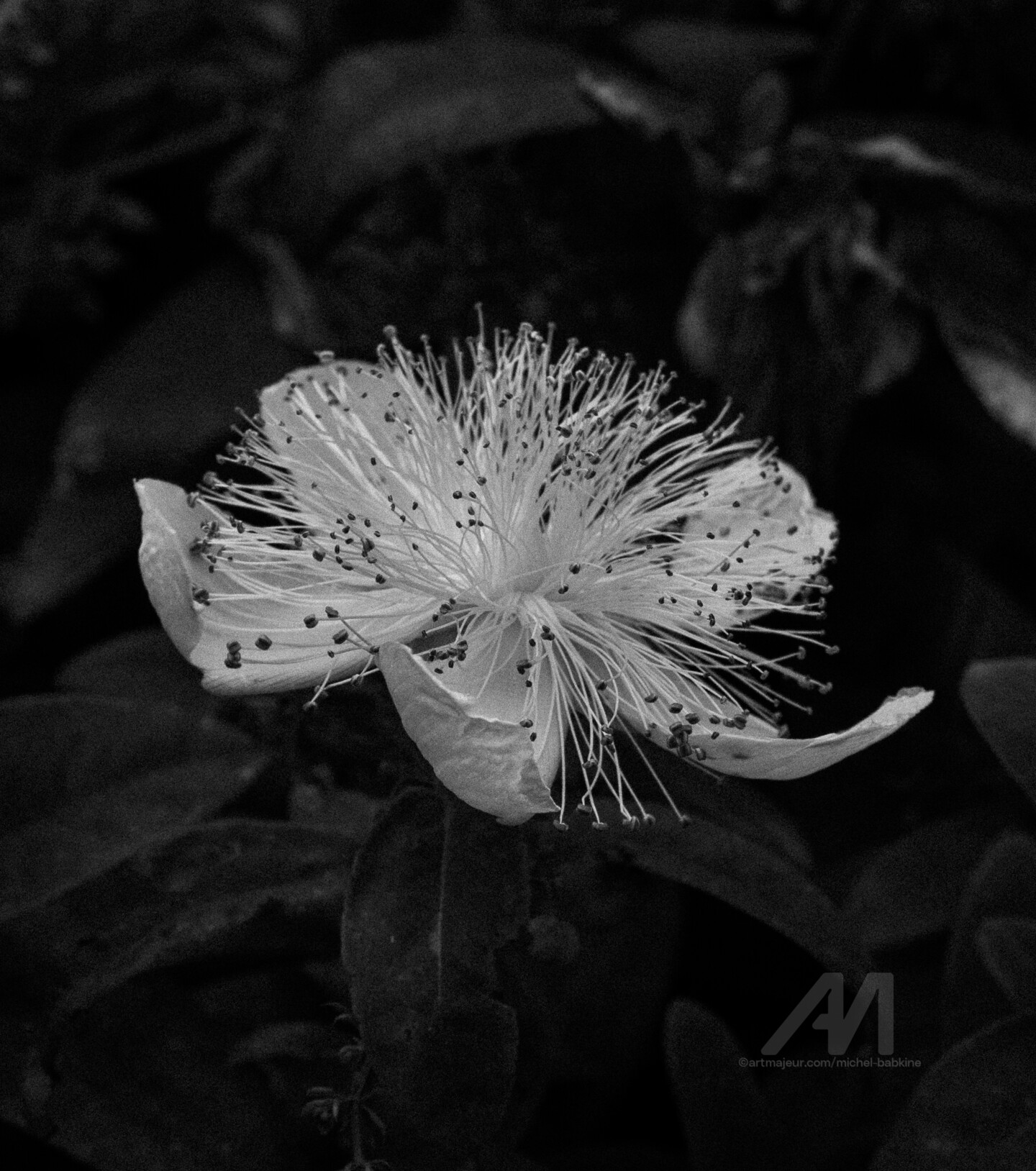 Scène de printemps. Imagée par une fleur reposant sur une haie. Contraste. Monochrome noir et blanc. La haie est foncée afin de mettre en valeur la fleur épanouie en plein soleil.