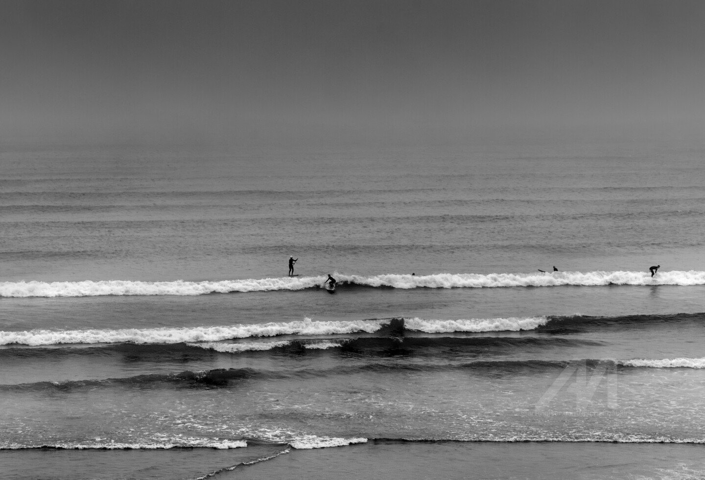 Devant la plage du riz Douarnenez. Finistère. Lever de brume. Plusieurs planchistes en action.